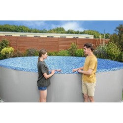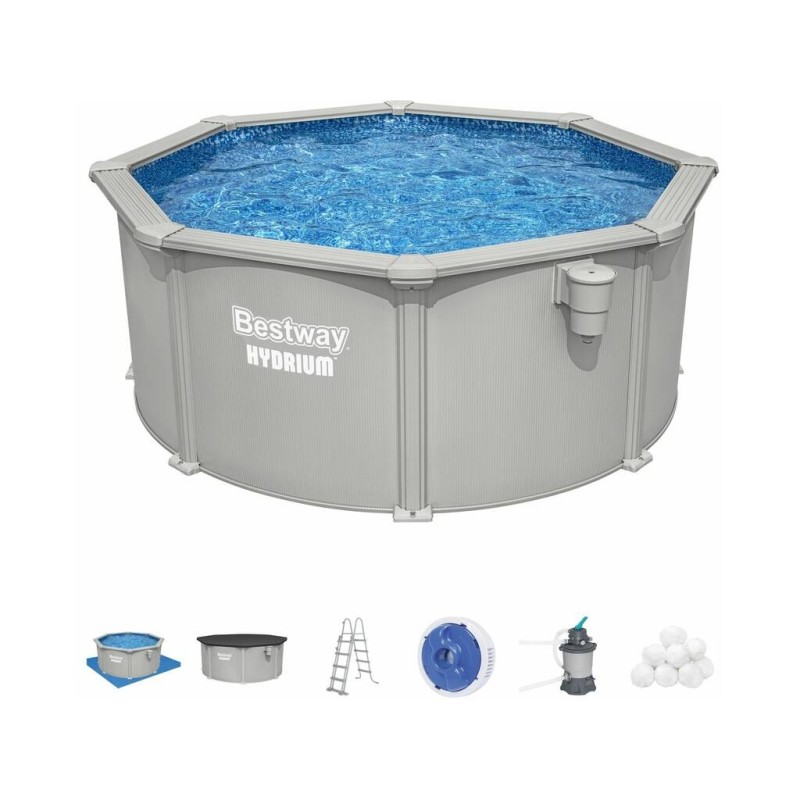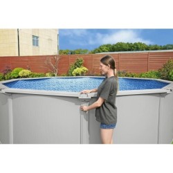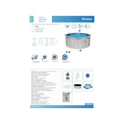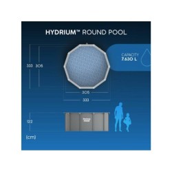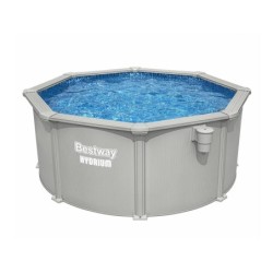 PISCINA BESTWAY HYDRIUM 56566 305 x 122 cm Fantástica para tu terraza o jardín. Gran resistencia. Características: - Cabida 7.630 Litros (al 90%, aprox.) - Tamaño 305 x 122 cm (diámetro x alto) - Espacio preciso con soportes 350 x 350 cm - Instalación 2 horas (aprox. entre 2 o 3 personas) - Borde superior alrededor de la piscina, de 16 cm anchura - Puede quedar montada todo el año Con: - Liner tratado para ser resistente a los rayos UV. - Depuradora de arena de 3.596 L/h. - Polysphere bolas de filtración para la depuradora. - Escalera de seguridad de 4 peldaños. - Dispensador Chemconnect. - Tapiz para el suelo. - Cubierta. - Skimmer.